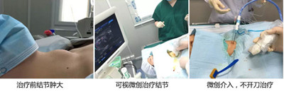 微创介入,一次性消除结节:超声引导,局部麻醉后将消融针穿刺入病灶组织进行消融,使其病变部位发生热固化,一次性将肿块细胞的活性完全消失。